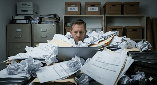 Imagen 1: El caos administrativo que hunde negocios. Un dueño de negocio superado por una montaña de papel, reflejando el error de no controlar los datos ni los documentos.
